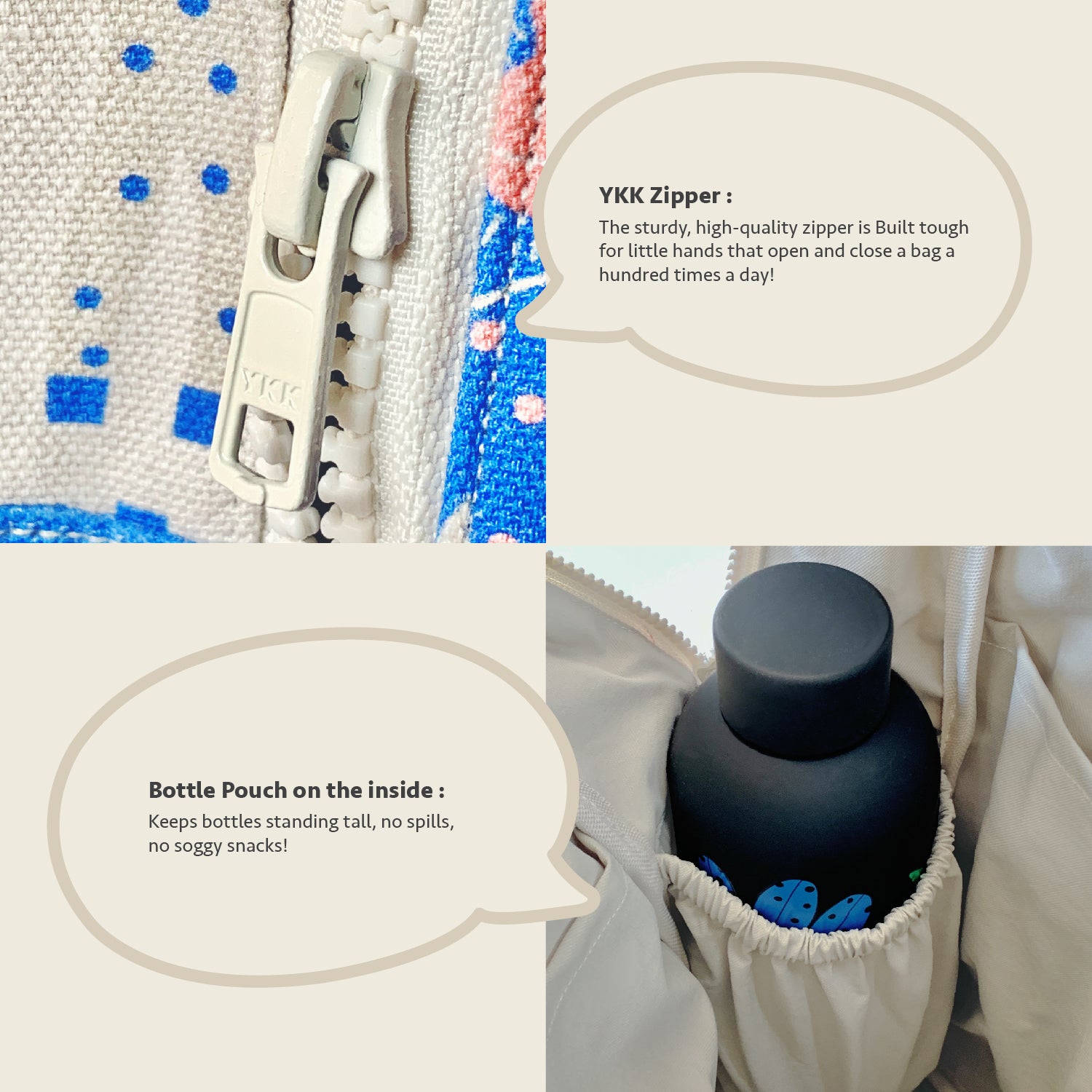 Inside, a waterproof lining keeps things tidy — just in case something leaks, or that wet swimsuit from the splash park sneaks in. It's easy to clean, too, because we know childhood gets messy. Thoughtfully finished with cotton straps for all-day comfort and a reflector strip for added visibility, even when the day stretches past sunset.