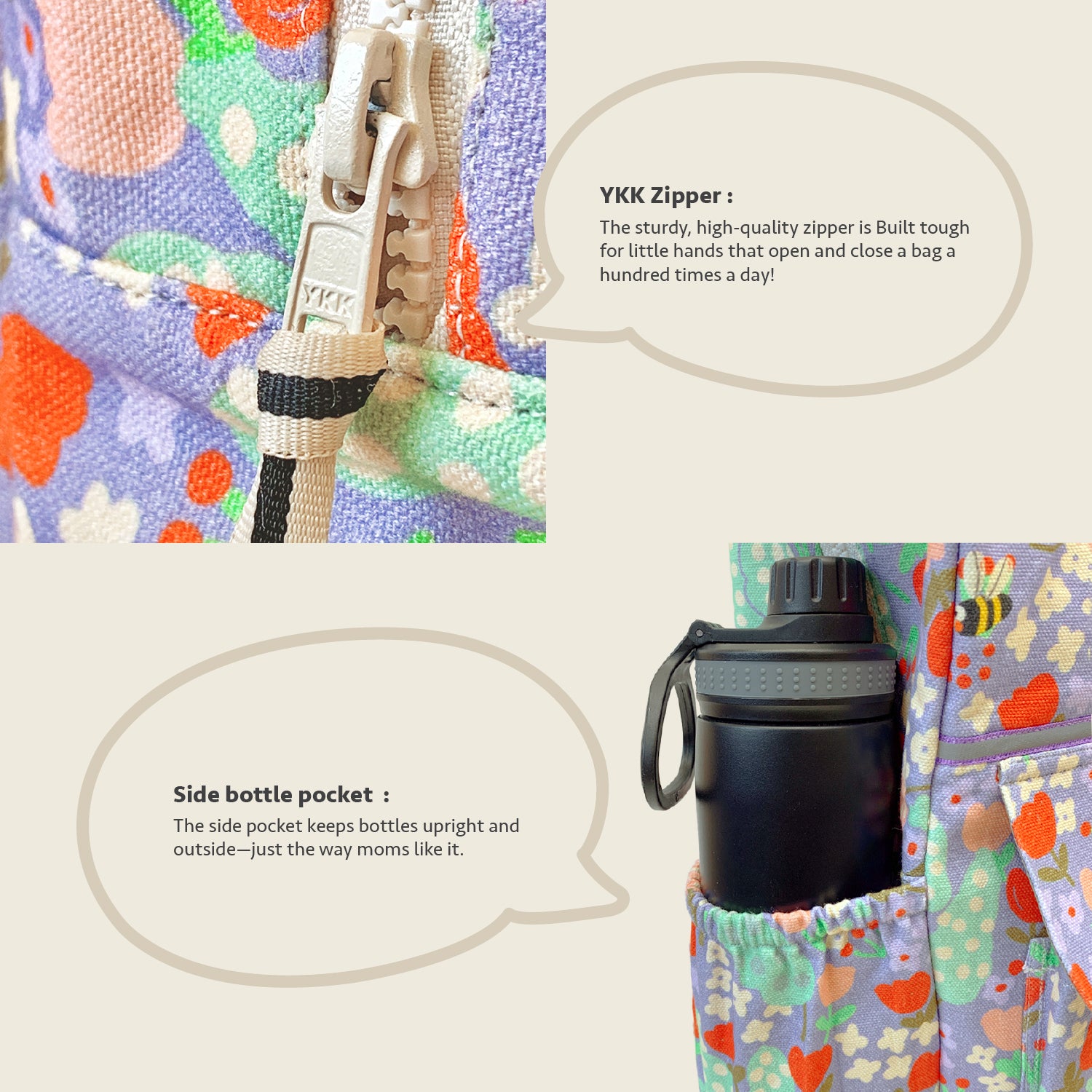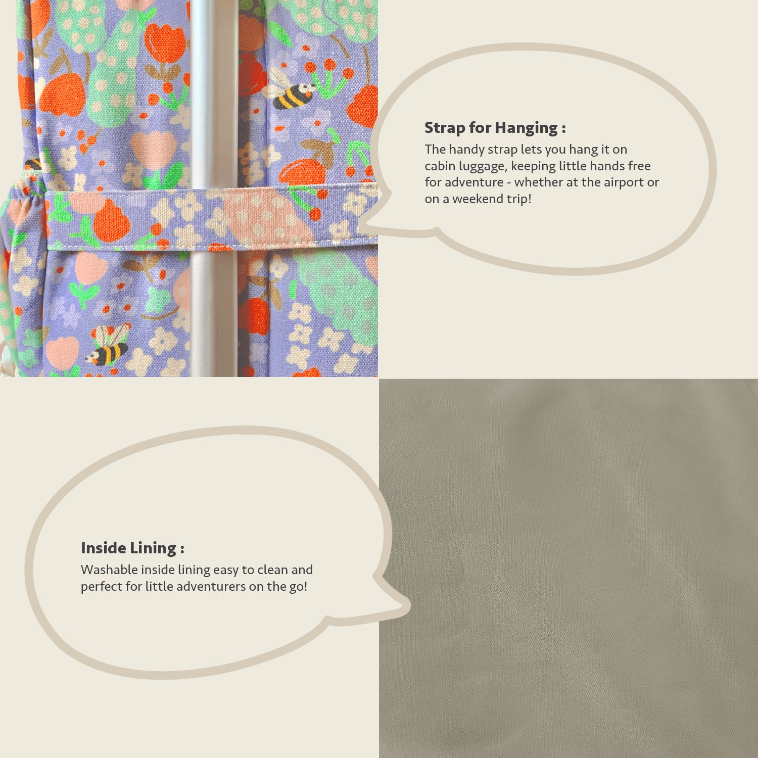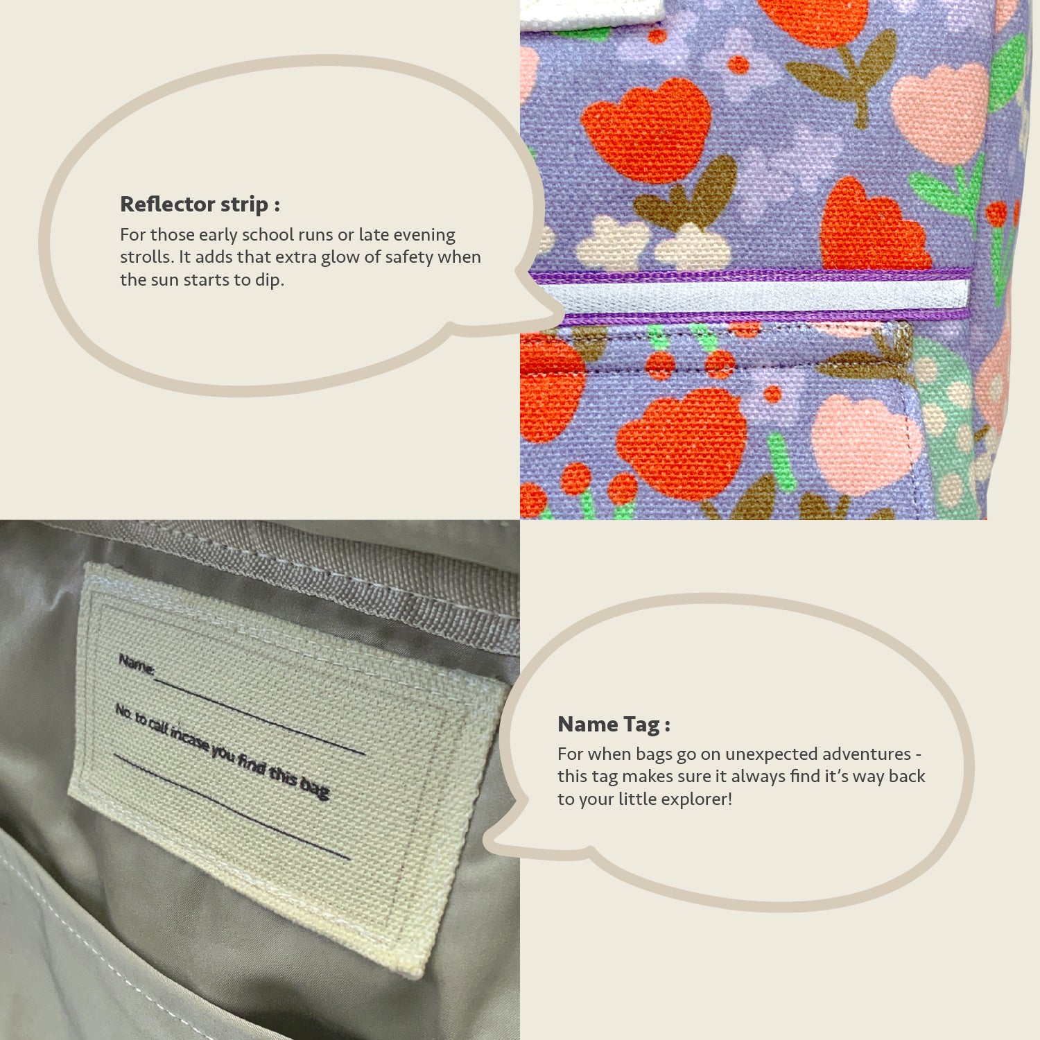 Inside, a waterproof lining keeps things tidy — just in case something leaks, or that wet swimsuit from the splash park sneaks in. It's easy to clean, too, because we know childhood gets messy. Thoughtfully finished with cotton straps for all-day comfort and a reflector strip for added visibility, even when the day stretches past sunset.