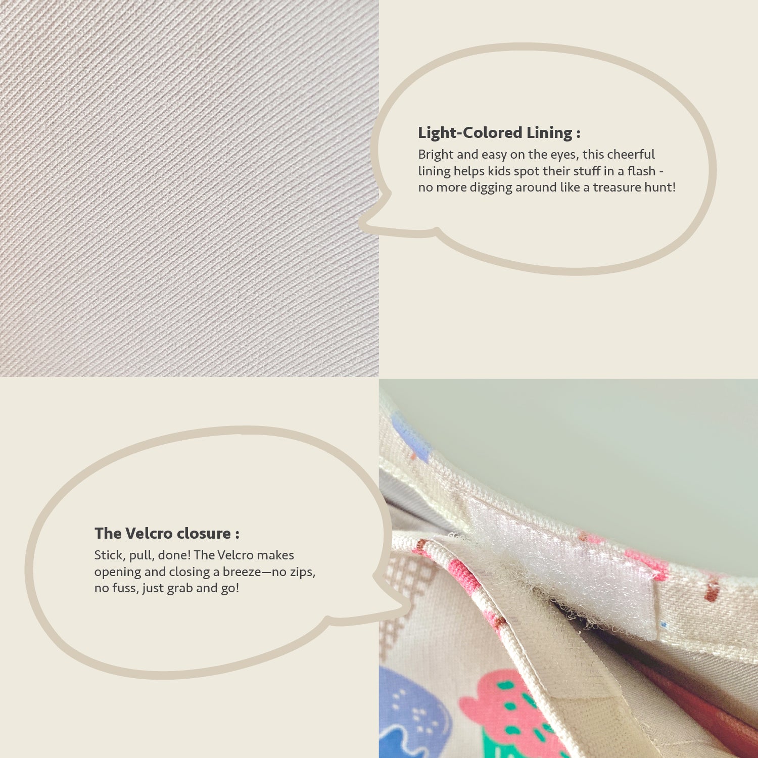 Velcro closure – Keeps the bag closed but easy for kids to open