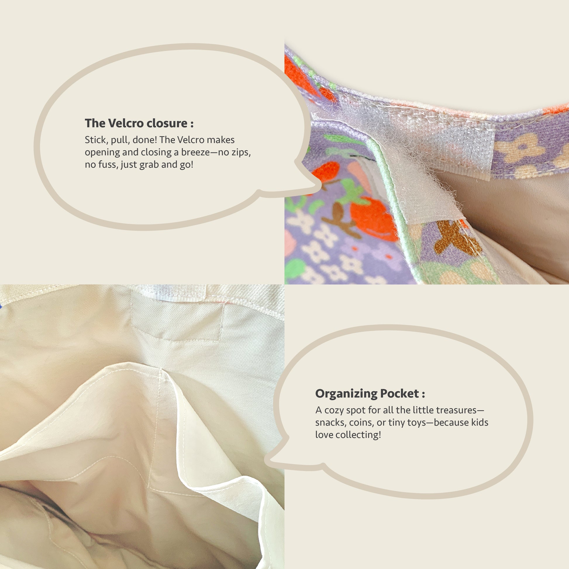 Velcro closure – Keeps the bag closed but easy for kids to open