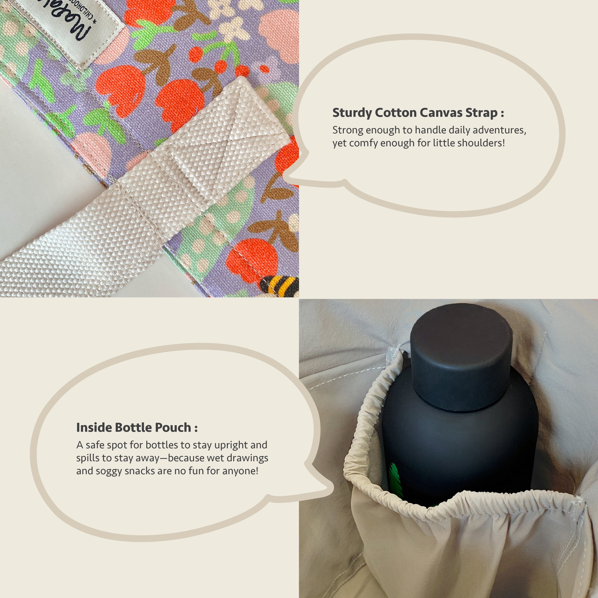 Crafted from 100% cotton canvas, it’s sturdy, breathable, and just the right size for little shoulders. The Velcro closure keeps things safely tucked in but easy for kids to access — no fumbling, no fuss.