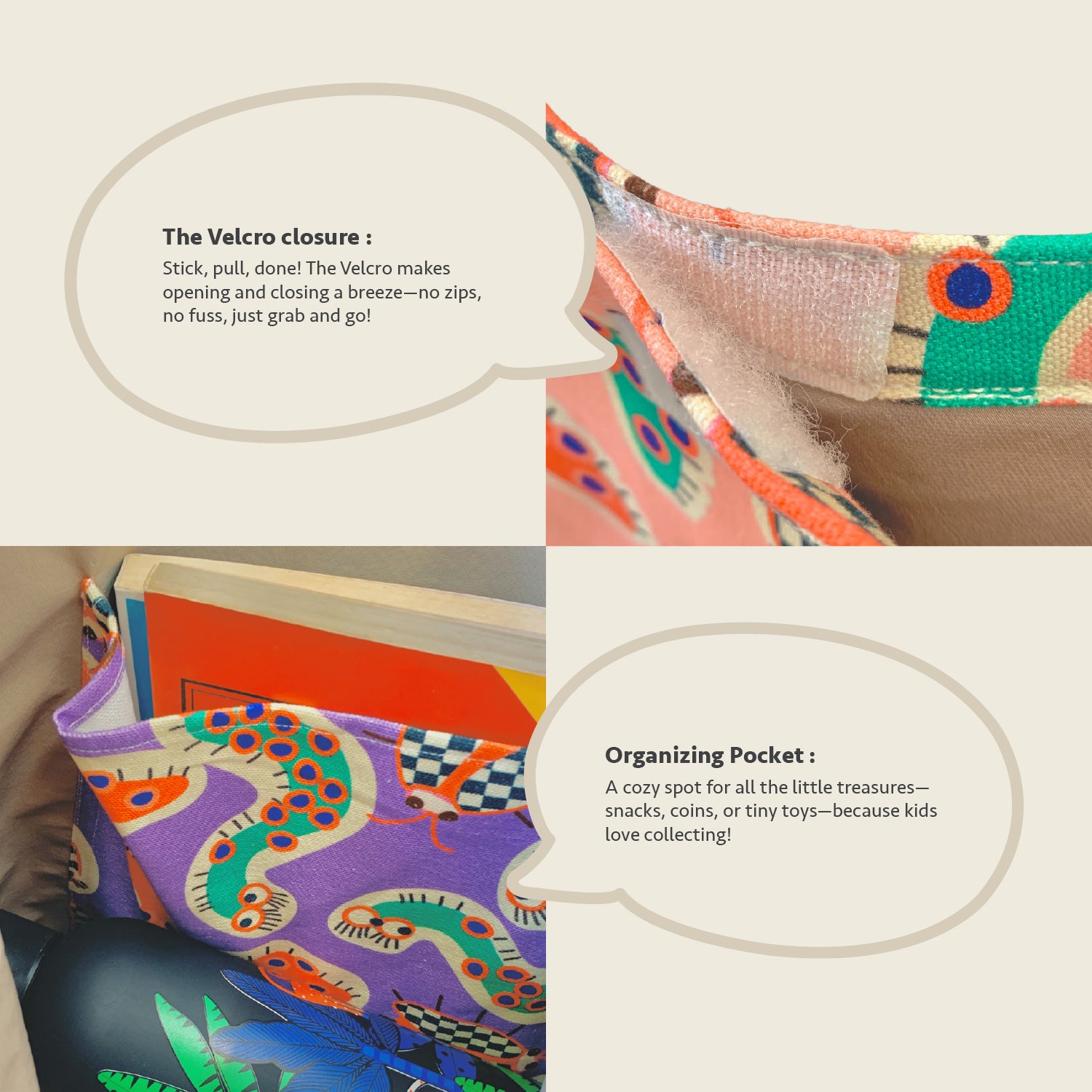 Velcro closure – Keeps the bag closed but easy for kids to open