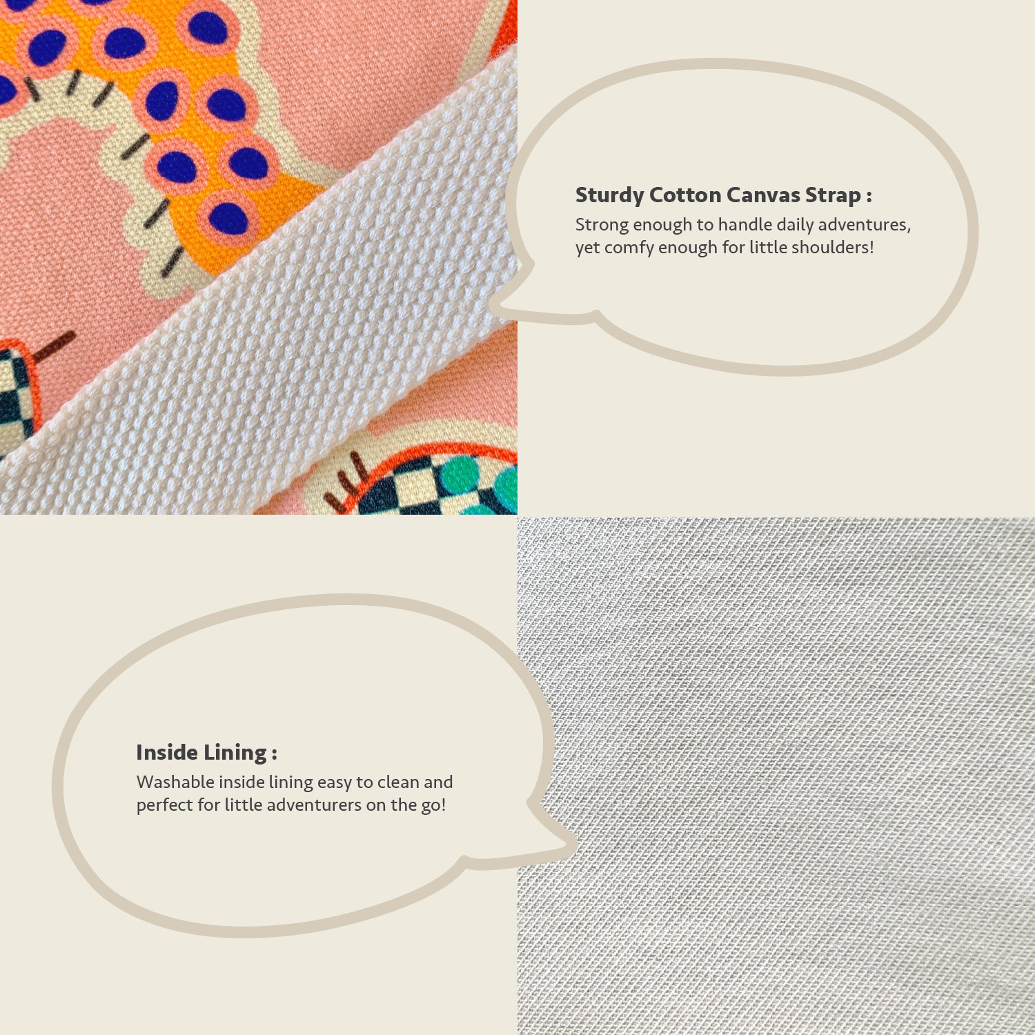 Crafted from 100% cotton canvas, it’s sturdy, breathable, and just the right size for little shoulders. The Velcro closure keeps things safely tucked in but easy for kids to access — no fumbling, no fuss.