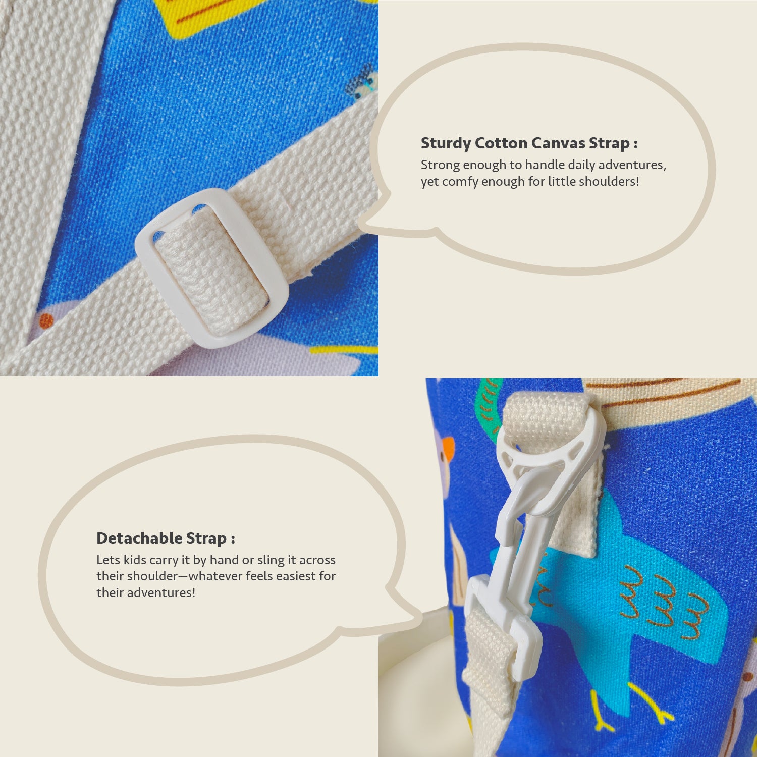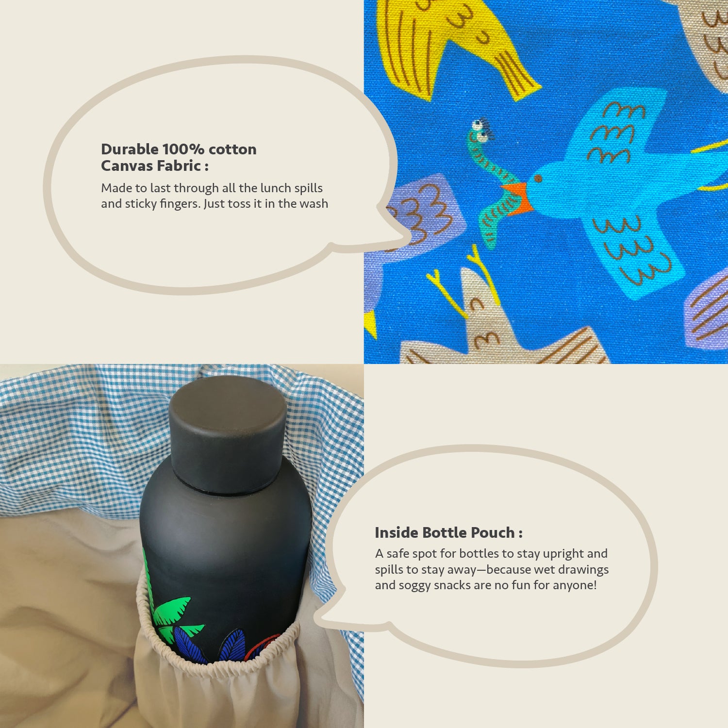 Meet the bag that’s as flexible as childhood itself. With a deep, “big-tummy” base, it easily swallows dabbas of every size, stacks of snacks. A built-in bottle holder keeps drinks upright, while the draw-string tie-up lets you fill it to the brim—no wrestling with stubborn zips.