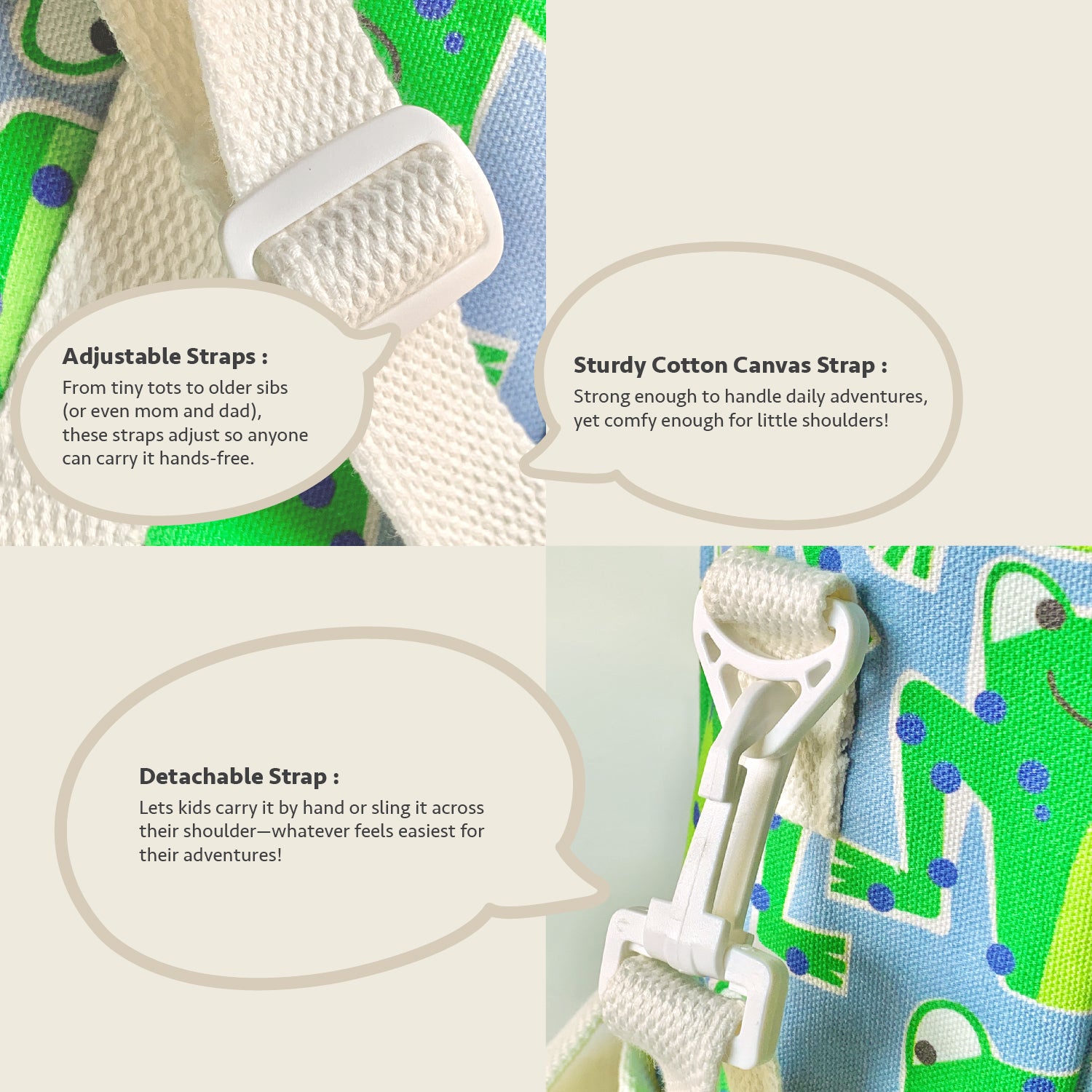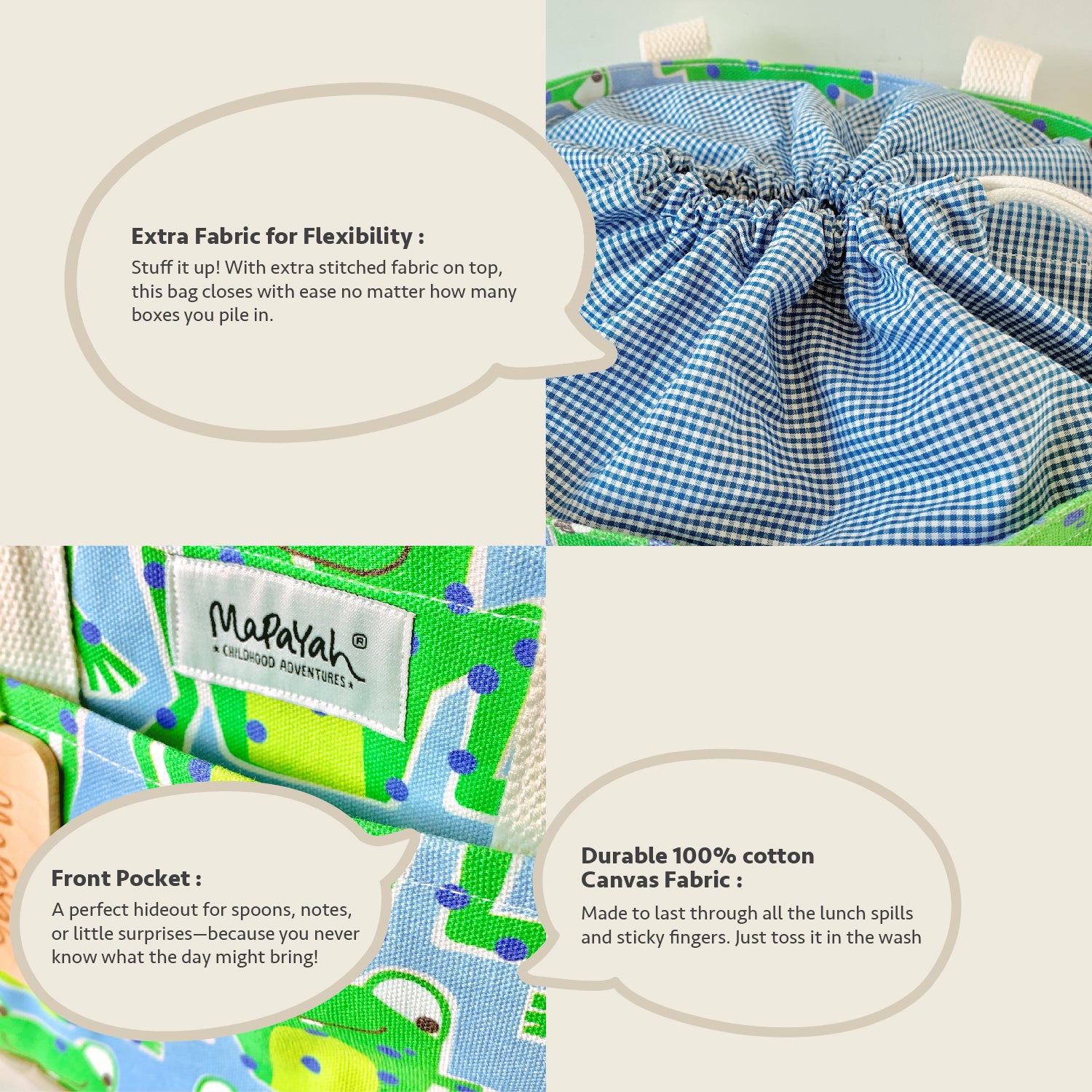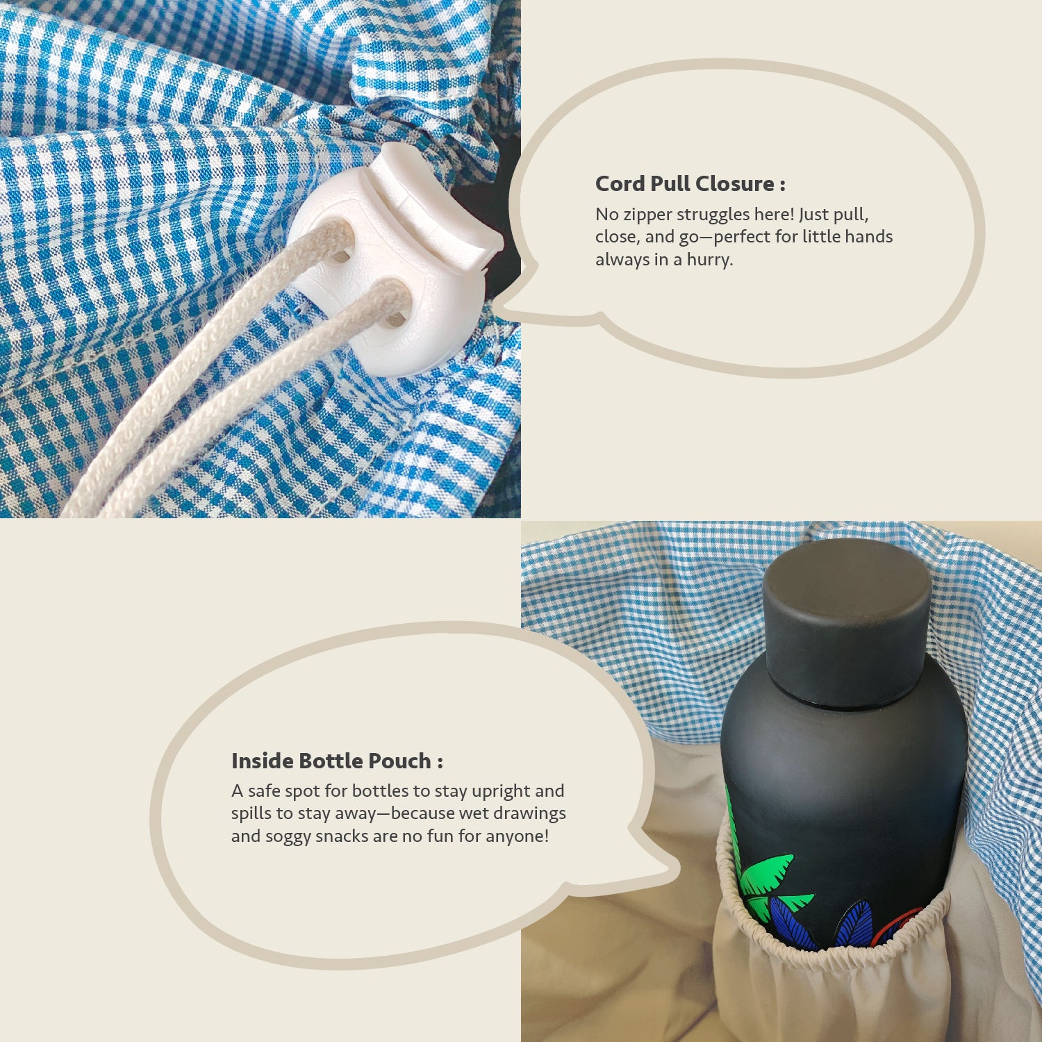 Meet the bag that’s as flexible as childhood itself. With a deep, “big-tummy” base, it easily swallows dabbas of every size, stacks of snacks. A built-in bottle holder keeps drinks upright, while the draw-string tie-up lets you fill it to the brim—no wrestling with stubborn zips.