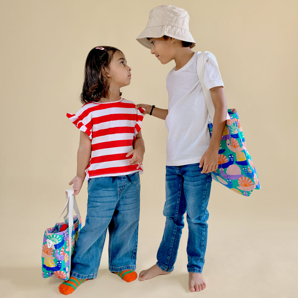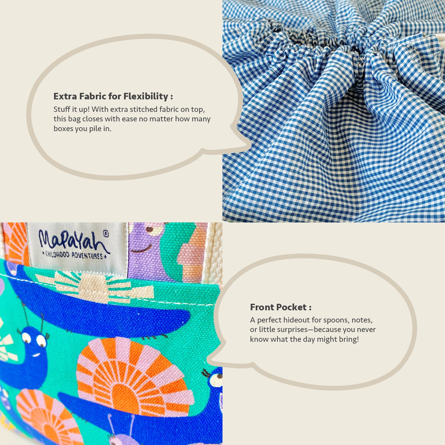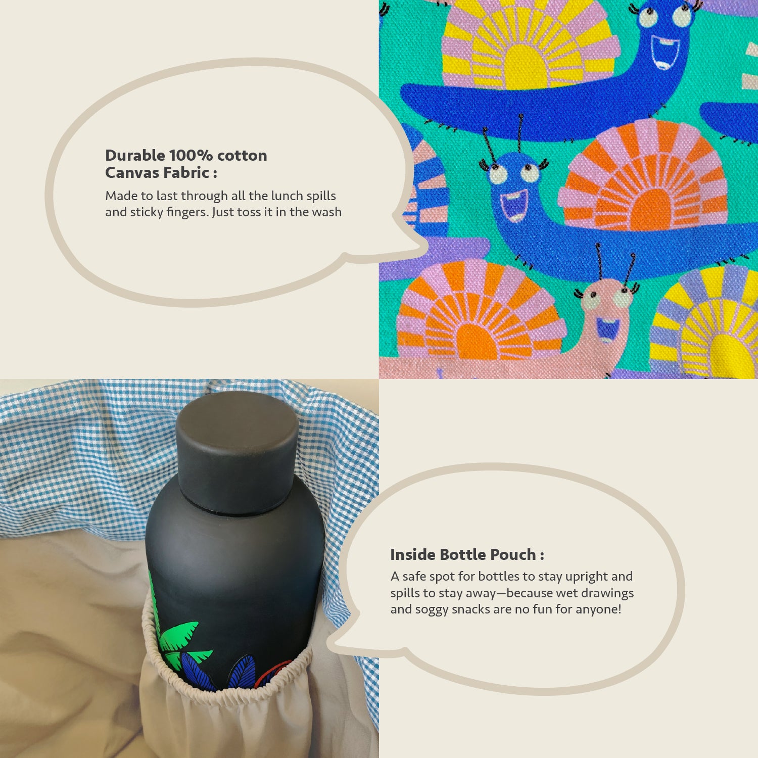 Meet the bag that’s as flexible as childhood itself. With a deep, “big-tummy” base, it easily swallows dabbas of every size, stacks of snacks. A built-in bottle holder keeps drinks upright, while the draw-string tie-up lets you fill it to the brim—no wrestling with stubborn zips.
