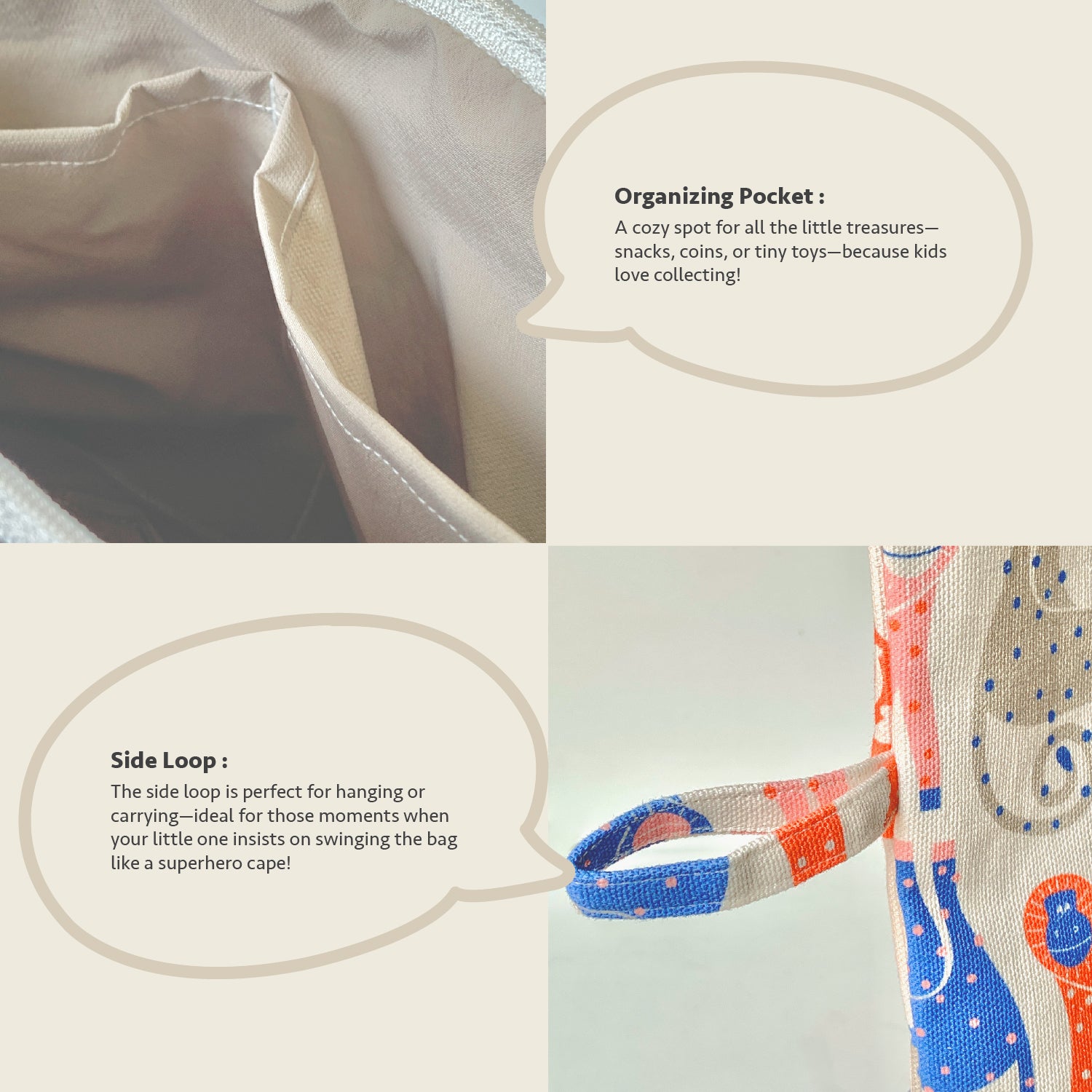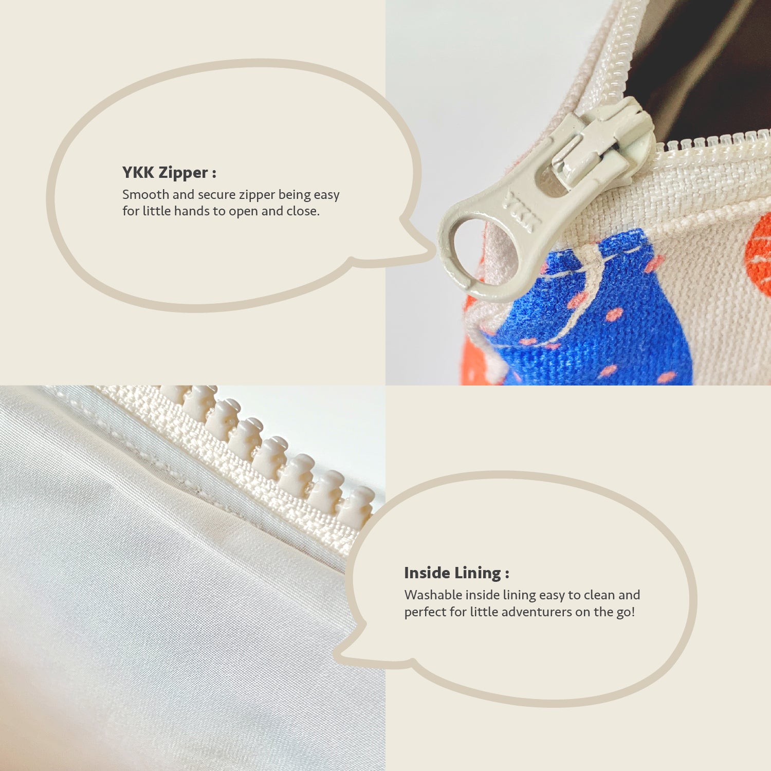 Crafted from 100% cotton canvas, it’s durable, breathable, and washable — made to handle all the scrapes, spills, and surprises that come with a child’s journey. A wipeable inner lining keeps things clean and simple, and a smooth YKK zipper ensures even little hands can open and close it with ease.